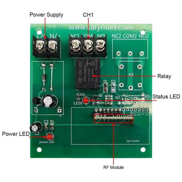 Notice: The receiver is dry relay output, not DC/AC power output. Initial state of relay output terminals: Terminals "NO" and "COM" are Normally Open; Terminals "NC" and "COM" are Normally Closed.