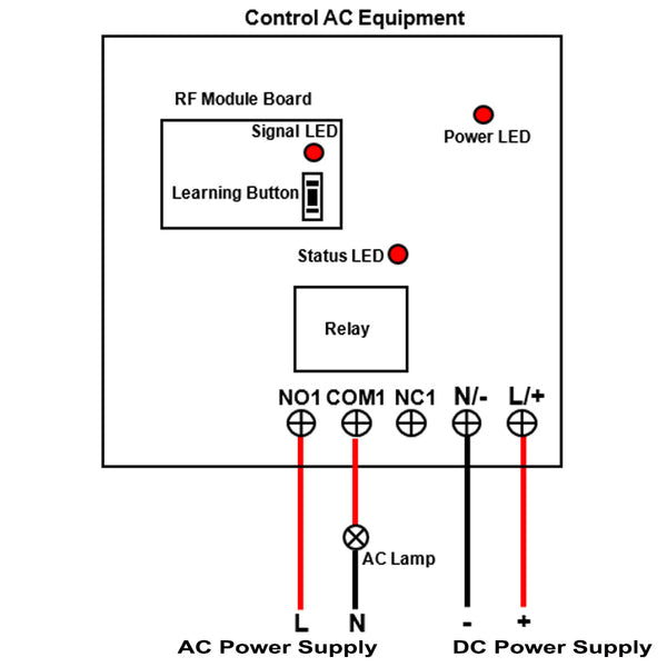 Relay Output: This receiver is dry relay output, it can be used to operate both DC and AC equipments. The output terminals are NO / NC (normally open / normally closed), which serves as a switch. That means you should also connect a separate power supply to equipments.