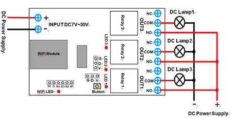 2) Connect the positive pole of the DC power supply to the output terminal "NO" of the WiFi switch, connect the output terminal "COM" of the WiFi switch to the positive pole of the DC lamp, and connect the negative pole of the DC lamp to the negative pole of the DC power supply.