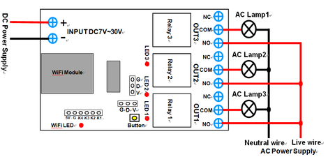 It is suitable for a variety of automation occasions, such as industrial, agricultural, commercial and home intelligence. Through the smart phone and the Internet, we can use this WIFI switch to realize remote control of various devices such as AC lamps, DC lamps, single color LED strips, fans, and household appliances etc. As long as the original device has an ON/OFF power switch, we can use this WiFi switch instead of the power switch to achieve intelligent control.