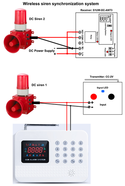 You can use this transmitter and the receiver to remotely control the AC or DC devices by the DC voltage signal of another device. Such as wireless siren synchronization system (see attached diagram). You can connect two wires from a DC siren to this transmitter, and connect another DC siren to the receiver, then two sirens will work synchronously.